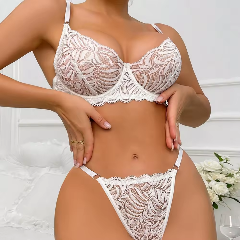 Seductive White Lace: Adorned with intricate white lace, this set exudes