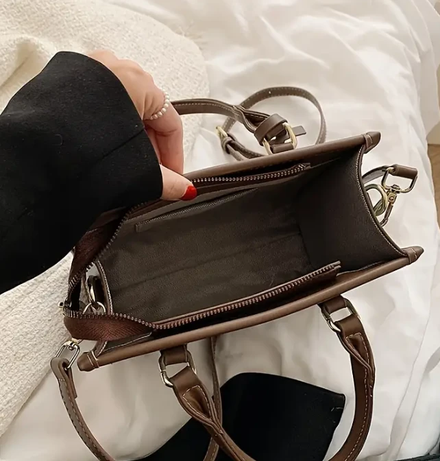 • Stylish square tote bag with a trendy color-blocking design